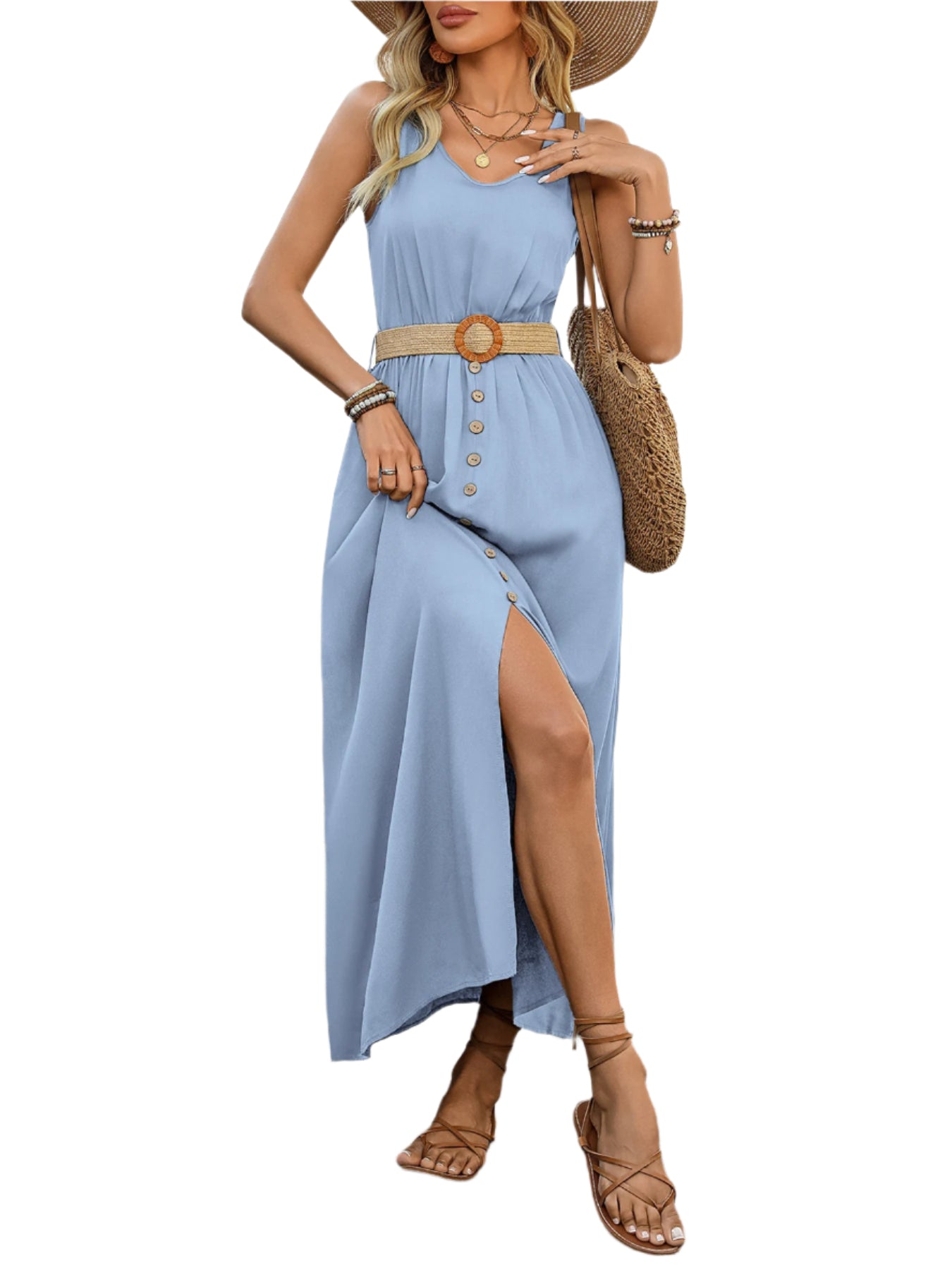 Summer Round-neck Sleeveless Split Dress With Button Design