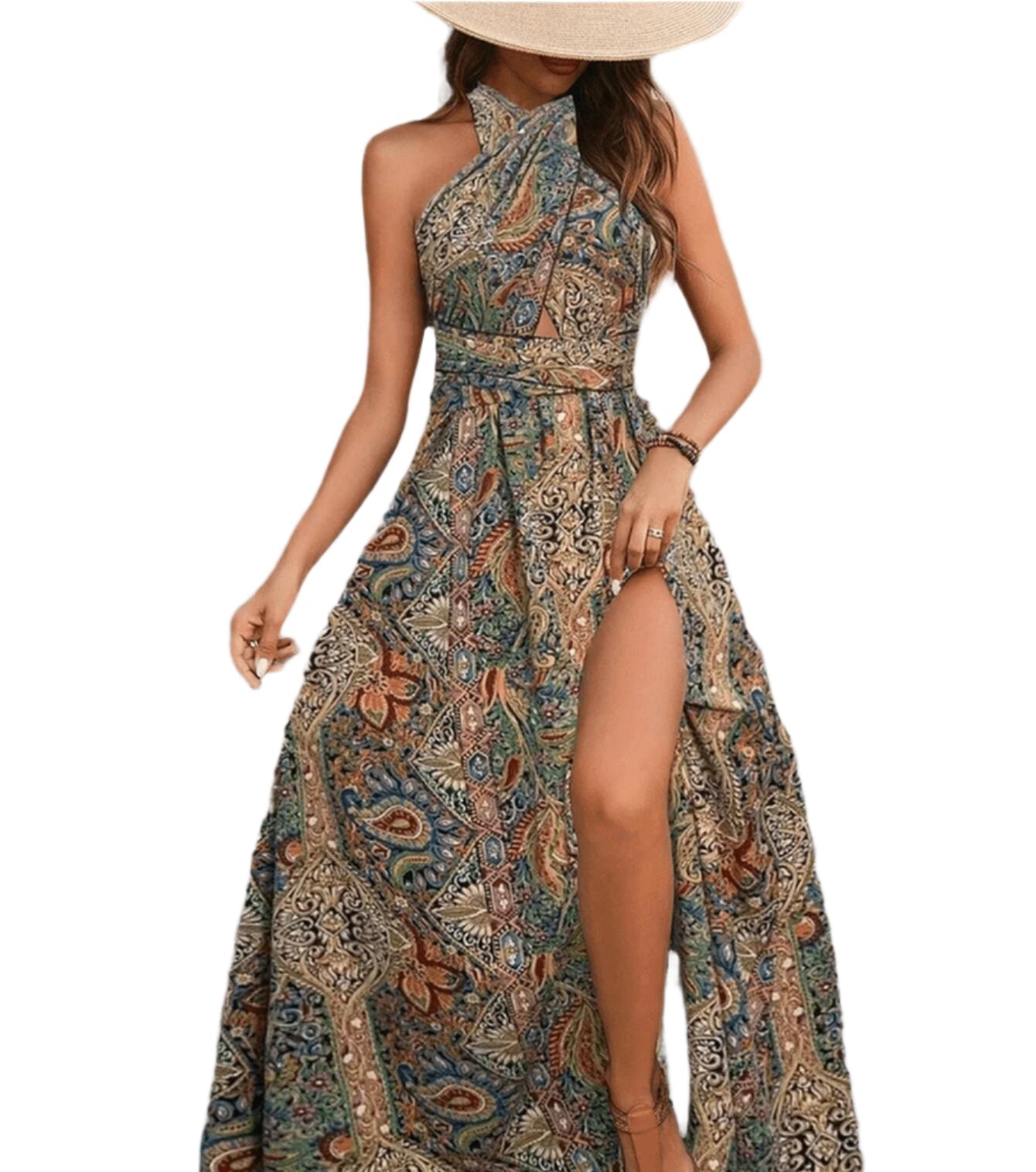 Women Print High Waisted Cross Halter Neck With Tie Maxi Dress